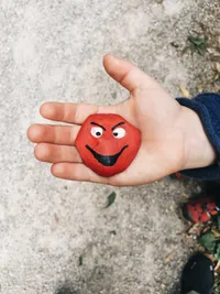 <figcaption>Emil´s hand presenting a Paderstone with a smiling red face drawn on it.</figcaption>