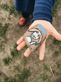 <figcaption>Emil´s hand with a Paderstone that has a sheep (or a dog) drawn on it.</figcaption>